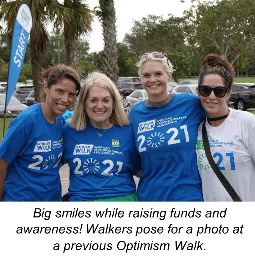 “Every Optimism Walk is an important opportunity for friends, families, and individuals who are affected by PD to come together and show support, share stories, get a little exercise, and leave feeling inspired and motivated” states APDA President & CEO Leslie A. Chambers. “It’s an important chance to bond with others who are similarly connected and to make a difference. Because the more funds we raise at each Optimism Walk, the more people we can help every day through much-needed support groups, exercise classes designed specifically for people with PD, educational conferences, and so much more.”