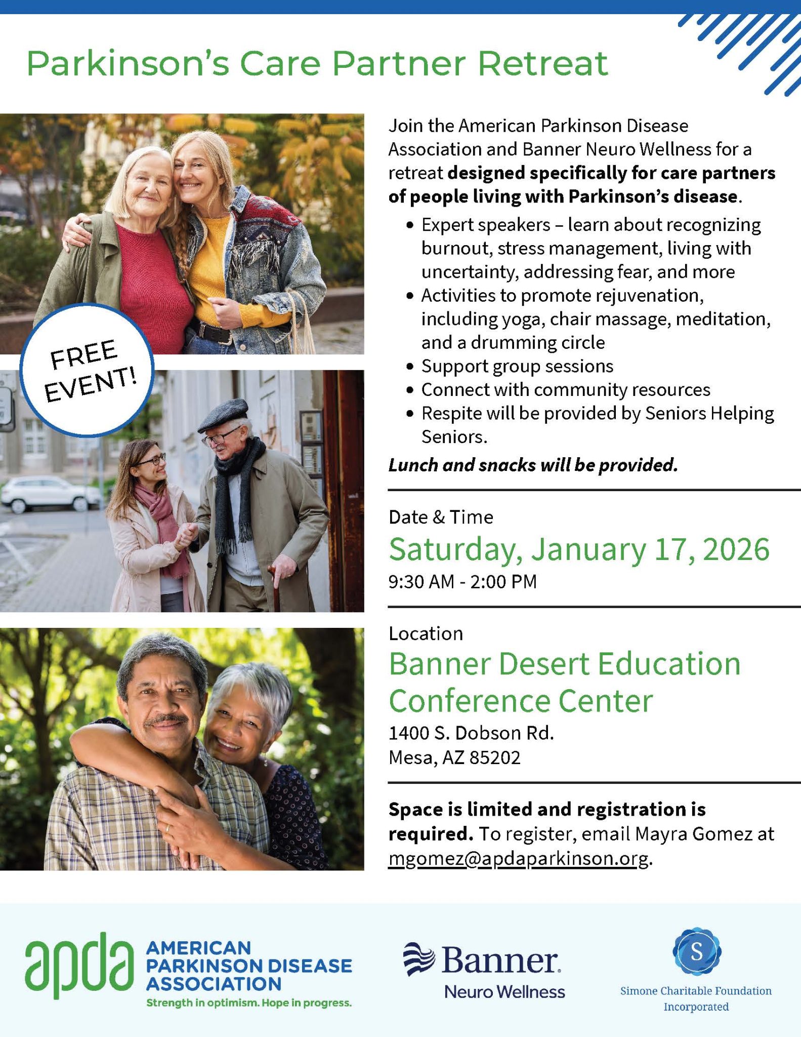 Welcome to the APDA Arizona Resource Page Dance for PD Wednesdays @ 9am MT Virtual Events Resources for Care Partners APDA Resources in Arizona The APDA works tirelessly every day to support and empower those in our community who are impacted by Parkinson’s disease (PD). We promote hope and optimism through innovative services, programs, education, and support, while also funding vital research. We are here to help you and your loved ones every step of the way. Contact APDA Arizona Laura Esquer, MSArizona Program DirectorPhone: 928-200-1192 P.O. Box 5447 Yuma, AZ 85366Email: lesquer@apdaparkinson.orgMayra GomezArizona Manager, Programs and Community EngagementPhone: 928-750-6281Email: mgomez@apdaparkinson.org Find Resources & Support Groups We provide local resources and support to the Parkinson’s community. Find a support group, join an art or movement class, get physical or occupational therapy, or take part in clinical trials. Discover all the resources that may be available to you brought to you by your local team at APDA. Parkinson Educational Program PD Wellness Brunch Join us for a Free Wellness Brunch dedicated to raisingawareness and sharing education about Parkinson’s disease.This community event will provide valuable information on livingtips, and local support resources. Date: Friday, December 13, 2025 Time: 10:00 a.m. – 1:00 p.m. Location: Adelante Healthcare Center This free event is open to individuals withParkinson’s and their caregivers. Registration is required. Register by email:mgomez@apdaparkinson.org Click here for flyer Free Online Movement Classes: Wednesday 9am- 10am MTOngoing dance classesOnline via ZoomClasses led byDance for PD®-trained teacher Alison MarshallRegister by email:lesquer@apdaparkinson.org Click here for flyer Virtual Yoga & Fitness Classes Virtual Fitness Class – Monday at 11AM MT Virtual Chair Yoga – Wednesday & Friday at 12:30PM MT Register by email:mgomez@apdaparkinson.org Click here for flyer Care Partners Group Mondays 10:00 a.m. to 11:00 a.m. MST (Zoom and in person) Click here for more information Caregivers Group The second Thursday of every month at 5:00 p.m. EST (Zoom) APDA Caregiver group English Fall ’23 Parkinson’s Care Partner Retreat Join the American Parkinson DiseaseAssociation and Banner Neuro Wellness for aretreat designed specifically for care partnersof people living with Parkinson’s disease.Expert speakers – learn about recognizingburnout, stress management, living withuncertainty, addressing fear, and moreActivities to promote rejuvenation,including yoga, chair massage, meditation,and a drumming circleSupport group sessionsConnect with community resourcesRespite will be provided by Seniors HelpingSeniors.Lunch and snacks will be provided. Saturday, January 17, 20269:30 AM – 2:00 PM Banner Desert EducationConference Center1400 S. Dobson Rd.Mesa, AZ 85202 Space is limited and registration isrequired. To register, email Mayra Gomez atmgomez@apdaparkinson.org. CLICK HERE TO DOWNLOAD FLYER FIND RESOURCES Recursos En Español Understanding the critical need to provide support to diverse Parkinson’s populations, APDA increased efforts to provide Spanish educational materials. To date, nine APDA brochures and supplements have been written in Spanish, and more continue to be developed. Additionally, APDA offers access to live phone support in Spanish through the 800-223-2732 toll-free helpline. Finally, an “En Español” section has been added to the APDA website to ensure that the Spanish-speaking community can get the important care and support they need. En Español Pensar Profundo Actividades mentales elaboradas por personas con lacondición de párkinson, que favorecen el ejerciciocognitivo, emocional y motivacional en personas conpatologías neurológicas, para ir mas allá de solo pensar. HORARIO:2:00 PM – 3:00 PM(EST) / 11:00AM-12:00PM(MST) FECHAS:Todos los Sabados a partir del 11 de Octubre hasta el 1 de Noviembre HORARIO:1:00 PM – 2:00 PM(EST) / 10:00AM- 11AM(PST) / 11:00AM-12:00PM(MST) FECHAS:Todos los Sabados a partir del 8 de Noviembre hasta el 20 de Diciembre Para preguntas y registracion favor de comunicarse con mgomez@apdaparkinson.org DESCARGAR FOLLETO AQUI _______________________________________________________________Tranquilidad de Espiritu PWR! MovesMartes y Viernes de 2:00 p.m. a 3:00 p.m. MSTPresencial y via ZoomMuhammad Ali Parkinson Center 240 W. Thomas Rd., Suite 302 Phoenix, AZ 85013PWR! Moves Chapter MenuAbout APDA ArizonaWays to GiveBecome a SponsorResources & SupportAt-Home ActivitiesArizona Support Groups Services We Provide: Educational programs and resources Support groups Exercise and wellness classes Information and referrals Financial support programs and much more Help Our Community Make an impact to help people with Parkinson’s in your local community. Your ongoing support makes our work possible. Please give what you can so that we may see a cure for Parkinson’s in our lifetimes. DONATE TODAY Contact APDA Email: apdaaz@apdaparkinson.org Phone: 928-200-1192 Address: PO Box 61420 Staten Island, NY 10306 Support Our Mission To support the PD community, please click the button below: Donate Today Ask a Doctor Share Your Story Search DonateChapter Menu