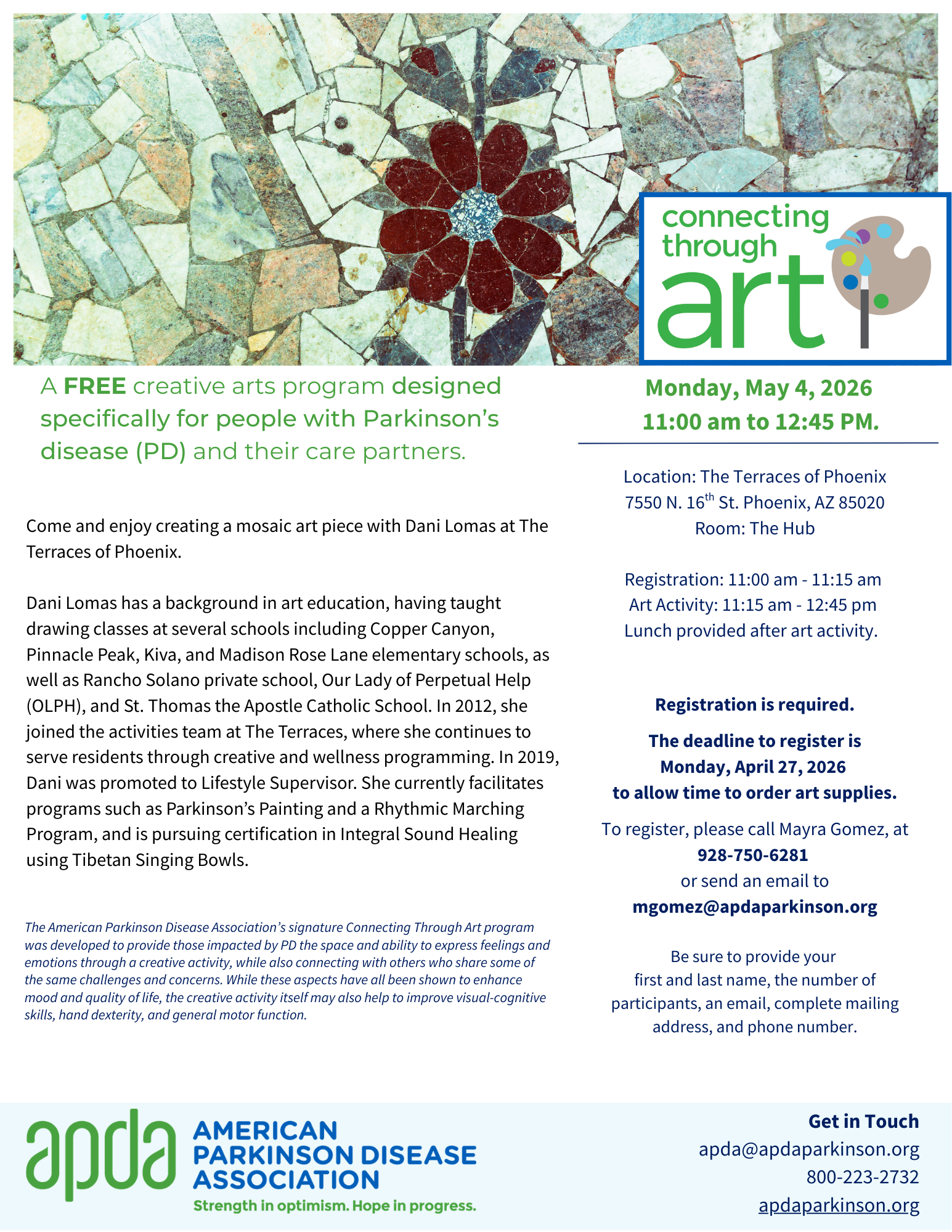 Registration is Required – To register, please call Mayra Gomez at 928-750-6281 or email at mgomez@apdaparkinson.org