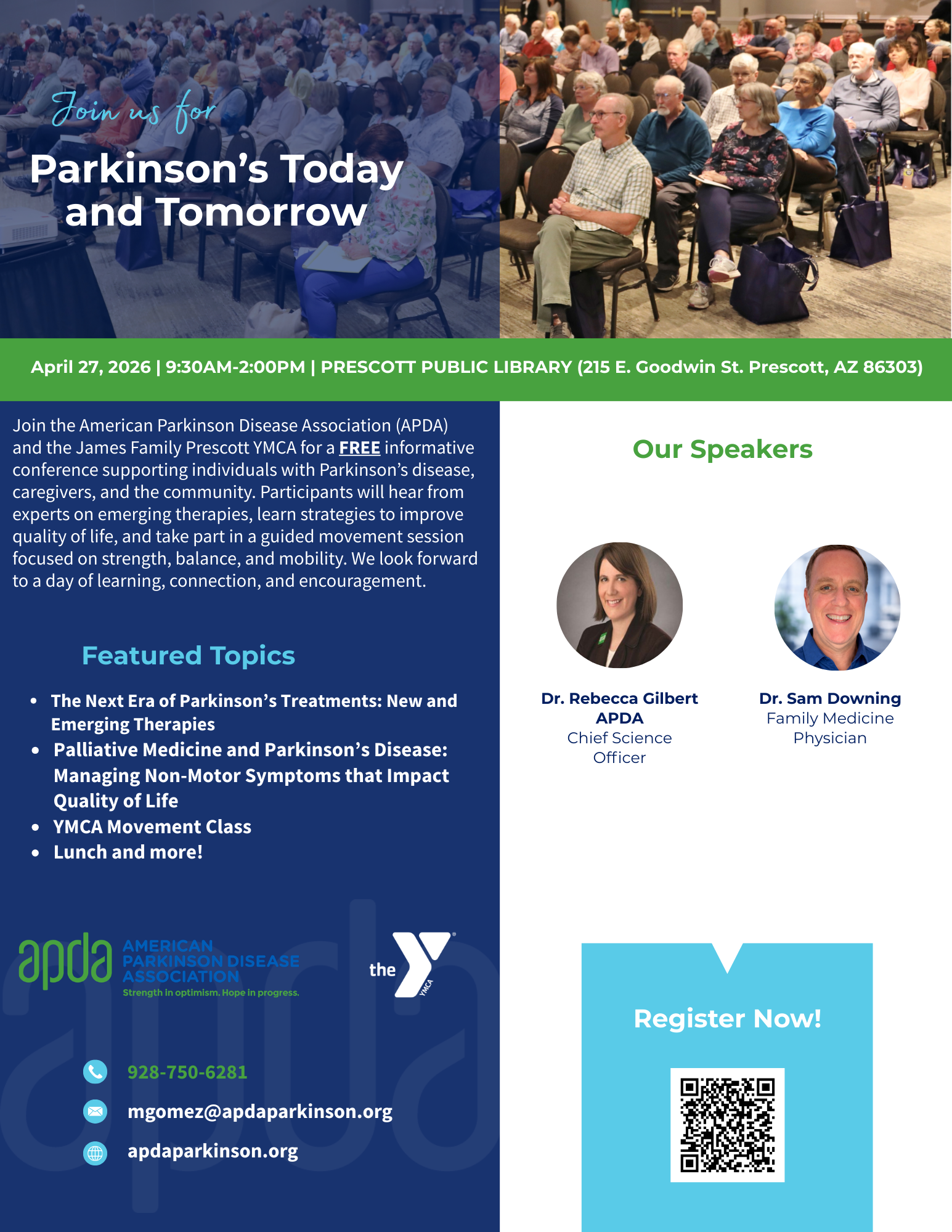 Join the American Parkinson Disease Association and the James Family Prescott YMCA for a complimentary, informative conference designed to support individuals living with Parkinson’s disease, their caregivers, and the broader community.