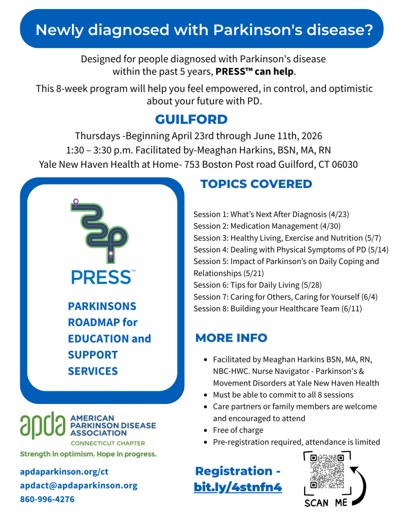 Newly Diagnosed- Your doctor says – “You have Parkinson’s”, Now what? We are here to help, with educational guides, videos, support groups and where to find a local Parkinson’s focused exercise program. Check out one of APDA Signature programs- PRESS for those newly diagnosed.