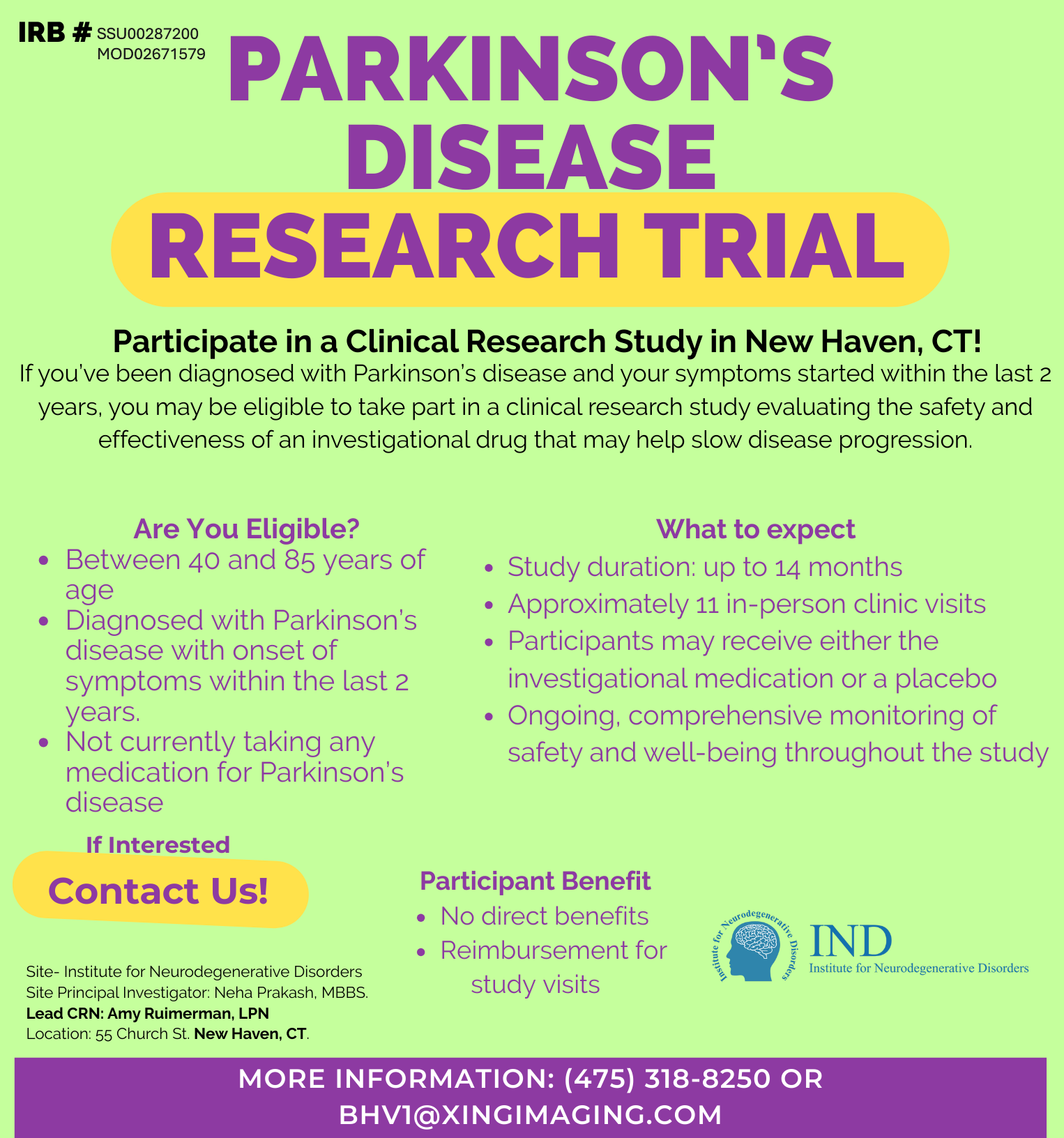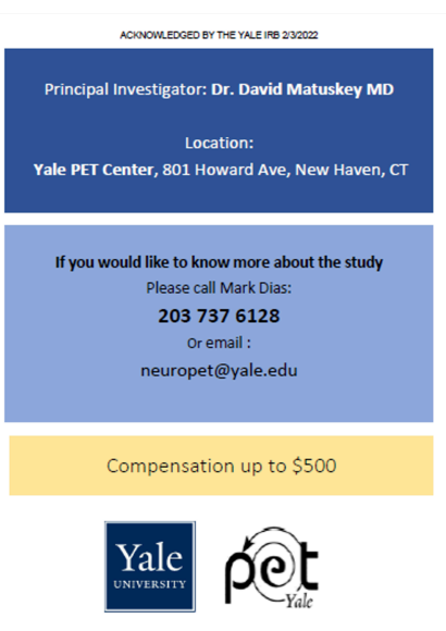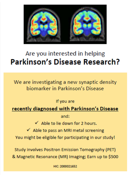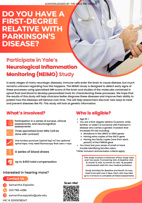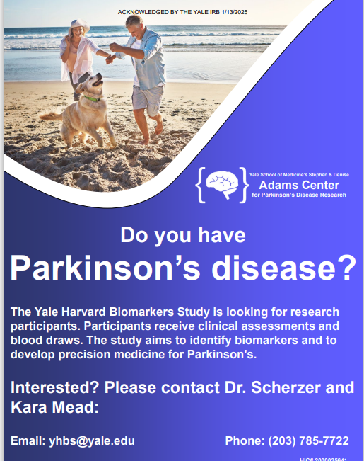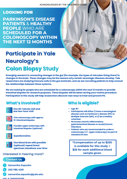 Clinical Studies in Connecticut Join our CommunityNewly Diagnosed? Check out the resources below and learn about APDA's Signature Program for newly diagnosed - PRESS™ (Parkinson’s Roadmap for Education and Support Services™)Parkinson's Education Programs Check out APDA’s publication “Understanding Clinical Trials: What you need to know” Sacred Heart University Doctor of Physical Therapy Program Do you have Parkinson’s Disease?Consider chair yoga to improve your walking and balance! About the studyWe are looking for people with PD to participate in a research study assessing the benefits of chair yoga on physical function! Join a certified yoga instructor and physcal therapist, along with student researchers, for 1 hour yoga sessions over 8 weeks! View Flyer NEW PD RESEARCH STUDYGait and CognitionSacred Heart University Movement Analysis LabContact Dr. Joshua Lander for more information(203)-226-2366 or josh@LSHS.pro Intestinal Immunity in Neurological Disease If you are due for a routine colonoscopy, you may be eligible for a research study trying to determine the causes of certain neurologic diseases, such as Multiple Sclerosis or Parkinson’s. Participants will undergo tissue biopsies during their routine colonoscopy and will have a blood draw. Anyone who is due for a screening colonoscopy may qualify for the study. Contact: MSResearch@yale.edu Email for more information- NEW! Augmentation in Restless Legs Syndrome We are recruiting patients with severe and worsening restless legs syndrome who are taking dopamine agonist medications, including ropinirole (Requip), pramipexole (Mirapex), or the rotigotine patch (Neupro). We will measure levels of particular hormones, called the melanocortin hormones in patients with RLS. Contact: brian.koo@yale.edu MASCOT Trial for Multiple System Atrophy (MSA) Yale is excited to offer an opportunity for people diagnosed with Multiple System Atrophy to participate in a clinical trial of a new investigational infusion therapy which may reduce the symptoms of the disease! Potential participants must be 40-75 years-old and can have MSA-P or MSA-C. Contact: moveresearch@yale.edu NEW! Imaging the Dopamine Transporter in Parkinson’s Disease Use PET imaging to examine in vivo measurement of the dopamine transporter (DAT) in PD and Healthy Control subjects. Contact: mark.dias@yale.edu Research happening regionally Massachusetts Research & Clinical Trials Clinicaltrials.gov Fox Trial Finder
