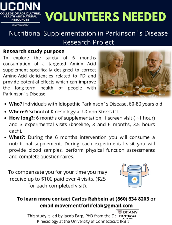 Clinical Studies in Connecticut Join our CommunityNewly Diagnosed? Check out the resources below and learn about APDA's Signature Program for newly diagnosed - PRESS™ (Parkinson’s Roadmap for Education and Support Services™)Parkinson's Education Programs Check out APDA’s publication “Understanding Clinical Trials: What you need to know” Sacred Heart University Doctor of Physical Therapy Program Do you have Parkinson’s Disease?Consider chair yoga to improve your walking and balance! About the studyWe are looking for people with PD to participate in a research study assessing the benefits of chair yoga on physical function! Join a certified yoga instructor and physcal therapist, along with student researchers, for 1 hour yoga sessions over 8 weeks! View Flyer 🧠 Help Advance Parkinson’s Research Participate in a Clinical Trial for Early Parkinson’s Disease UConn Health is conducting a research study to see the effectiveness and safety of an investigational drug called “BHV-8000” as a possible treatment for adults living with early Parkinson’s disease. We are looking for men and women who: Are aged 40 to 85 Have been diagnosed with Parkinson’s disease within the last 2 years Are not taking any medications to treat their Parkinson’s disease and are not expected to need any such medication during the study (48 weeks) Are able to attend regular study visits at our site in Farmington, CT There are other criteria that you will need to qualify for the study. For further information, please contact: 📞 Call Sheila Thurlow, RN: (860) 679-4637📧 Email: thurlow@uchc.edu📍 Location: UConn Health, Farmington, CT🚗 Free parking available IRB Approved Study | Principal Investigator: Dr. Bernardo Rodrigues IRB #: SSU00291361 NEW PD RESEARCH STUDYGait and CognitionSacred Heart University Movement Analysis LabContact Dr. Joshua Lander for more information(203)-226-2366 or josh@LSHS.pro Intestinal Immunity in Neurological Disease If you are due for a routine colonoscopy, you may be eligible for a research study trying to determine the causes of certain neurologic diseases, such as Multiple Sclerosis or Parkinson’s. Participants will undergo tissue biopsies during their routine colonoscopy and will have a blood draw. Anyone who is due for a screening colonoscopy may qualify for the study. Contact: MSResearch@yale.edu Email for more information- NEW! Augmentation in Restless Legs Syndrome We are recruiting patients with severe and worsening restless legs syndrome who are taking dopamine agonist medications, including ropinirole (Requip), pramipexole (Mirapex), or the rotigotine patch (Neupro). We will measure levels of particular hormones, called the melanocortin hormones in patients with RLS. Contact: brian.koo@yale.edu MASCOT Trial for Multiple System Atrophy (MSA) Yale is excited to offer an opportunity for people diagnosed with Multiple System Atrophy to participate in a clinical trial of a new investigational infusion therapy which may reduce the symptoms of the disease! Potential participants must be 40-75 years-old and can have MSA-P or MSA-C. Contact: moveresearch@yale.edu Research happening regionally Massachusetts Research & Clinical Trials Clinicaltrials.gov Fox Trial Finder