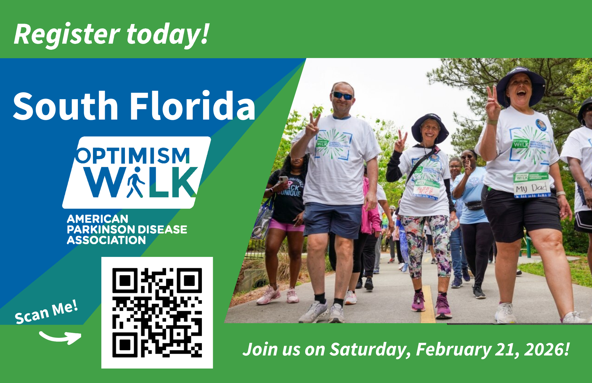 Upcoming Florida Chapter Events Join our CommunityUpcoming Florida Chapter Events Polk County Optimism Walk Sunday, November 16 Walkers will come together nationwide in 2025 to step forward in support of all people affected by Parkinson’s disease. Your fundraising dollars at the Polk County Walk will go directly toward the local community, expanding local programs and services to help more people with Parkinson’s disease live life to the fullest, as well as fund cutting-edge research to help find better treatments and ultimately, a cure. Learn More & Register Here South Florida Exercise & Wellness Classes Port St Lucie starting October 28th! Coming Soon to Stuart The APDA Florida Chapter is proud to present an Exercise Pilot in the community, providing free exercise courses to those living with Parkinson’s and their Care Partners. Register here PD Journal Club Wednesday, November 12 Are you a person with Parkinson’s disease or a care partner interested in learning more about PD clinical trials and published research? The Parkinson’s Journal Club is for you! Registration is required to join VIRTUALLY as Dr. Dalvi of Palm Beach Neuroscience Institute dives into a quarterly event, navigating clinical trial results and research studies. Register here South Florida Optimism Walk Saturday, February 21, 2026 Walkers will come together nationwide in 2026 to step forward in support of all people affected by Parkinson’s disease. Your fundraising dollars at the South Florida walk will go directly toward the local community, expanding local programs and services to help more people with Parkinson’s disease live life to the fullest, as well as fund cutting-edge research to help find better treatments and ultimately, a cure. Learn More & Register Here