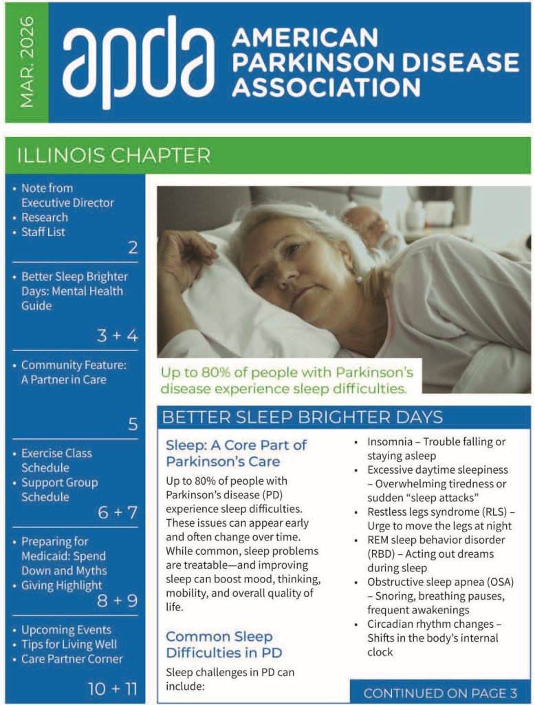 Each issue includes helpful information about local Illinois programs, inspiring community stories, and practical tools for people living with Parkinson’s and their care partners. Browse below to view the latest edition and sign up to receive your newsletter!