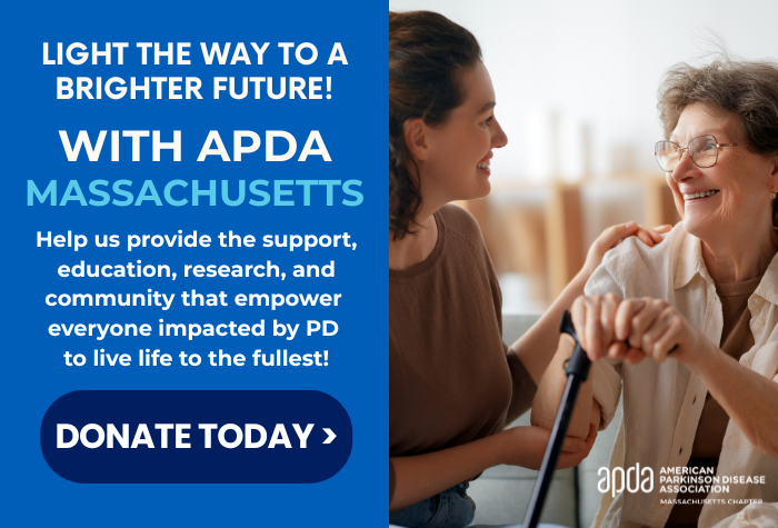 Welcome to the APDA Massachusetts Chapter Check out pictures from this year’s Magic of Hope Gala & Auction! View Upcoming Programs Click Here to Make a Donation About the APDA Massachusetts Chapter The APDA Massachusetts Chapter works tirelessly every day to support and empower those in our community who are impacted by Parkinson’s disease (PD). We promote hope and optimism through innovative services, programs, education, and support, while also funding vital research. We are here to help you and your loved ones every step of the way. Services we provide: Educational programs and resources Support groups Exercise and wellness classes Information and referrals Financial support programs and much more Building Community The APDA Massachusetts Chapter also provides funding to support health and wellness initiatives across the state. Visit our Community Grant Program page to learn more. Find Resources & Support Groups We provide local resources and support to the Parkinson’s community. Find a support group, join an art or movement class, get physical or occupational therapy, or take part in clinical trials. If you need further guidance in finding resources and support, contact our APDA Information & Referral Center at Boston University Medical Campus (BUMC) at 617-638-8466 or toll-free at 800-651-8466, or email apdama@apdaparkinson.org. Discover Resources Receive Our Newsletter APDA Massachusetts Contact Information APDA Information & Referral Center at Boston University Medical Campus (BUMC) 85 East Concord Street, Ground FloorBoston, MA 02118 **For information about Parkinson’s disease and support programs, please contact:Cathi Thomas, RN, MS617-638-8466800-651-8466apdama@apdaparkinson.orgneurocat@bu.edu APDA Massachusetts ChapterMailing Address APDA Massachusetts15 S Main Street, PO Box 272Sharon, MA 02067 APDA Massachusetts Chapter Staff **For questions related to the APDA Massachusetts Chapter, please contact:Jessica van der Stad, Executive Director617-634-2497jvanderstad@apdaparkinson.org APDA Centers for Advanced Research in Massachusetts APDA Center for Advanced Research at Boston University Chobanian & Avedisian School of Medicine Boston University Chobanian & Avedisian School of Medicine: Marie HĂ©lène Saint-Hilaire, MD, FRCP (C), Director APDA funding supports: Studies to identify potential PD biomarkers Characterization of PD among various ethnic groups Exercise intervention, wearable technology and attention training clinical trials Approximately 4000 patient visits per year – Deep Brain Stimulation Program APDA Center for Advanced Research at Brigham and Women’s Hospital, Harvard Medical School Brigham and Women’s Hospital, Harvard Medical School: Vikram Khurana, MD, PhD, Director APDA funding supports: Studies that probe the biology of PD-causing genetic mutations A biomarker discovery program using specimens from more than 2,700 participants A drug discovery program that utilizes technologies such as stem cells and big data analytics Approximately 2,200 patients visits each year Help Us Help Our Community Make an impact to help people with Parkinson’s in your local community. Your ongoing support makes our work possible. Please give what you can to help people with Parkinson’s disease live life to the fullest. Donate Today Chapter MenuGive to APDA Massachusetts ChapterMake a DonationSponsor the APDA Massachusetts ChapterBecome a VolunteerMake a Monthly DonationResources & SupportEducational ProgramsSupport GroupsResearchCare Partner ResourcesAdd me to the APDA Massachusetts Chapter Mailing ListPhysical Therapy, Occupational Therapy and Speech ProgramsArts and Movement ClassesBoxing ClassesArt & Music ClassesTai Chi ClassesExercise ClassesYoga ClassesDance ClassesAdditional ResourcesHome Modification and AssessmentPsychosocial SupportMedication ResourcesMovement Disorder SpecialistsLegal and Employment SupportEldercare ResourcesDriving and Transportation ResourcesDiscounted, Gently Used, and Donated Medical EquipmentDental HealthAPDA National Resource Center for RehabilitationUpcoming Events & ProgramsThe Magic of Hope Gala & AuctionAbout the APDA Massachusetts ChapterAPDA Massachusetts Chapter Staff and Board of DirectorsAPDA Information & Referral CenterCommunity Grant ProgramContact Us Contact APDA Email: apdama@apdaparkinson.org Phone: 800-651-8466 Address: (MAILING ONLY) APDA Massachusetts 15 S Main Street, PO Box 272 Sharon, MA 02067 Support Our Mission To support the PD community, please click the button below: Donate Today Ask a Doctor Share Your Story Search DonateChapter Menu