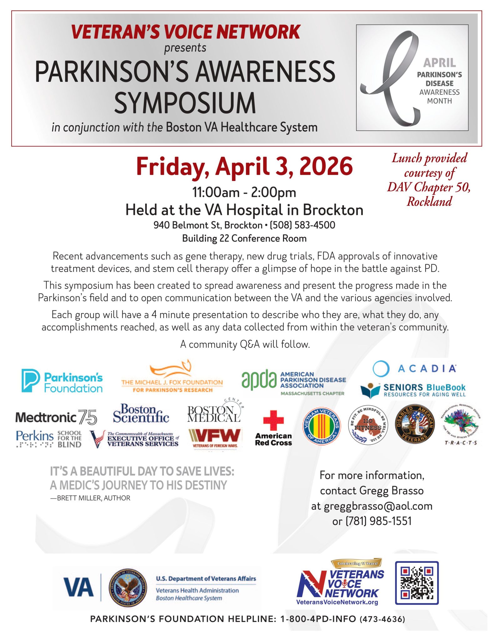 This symposium has been created to spread awareness and present the progress made in the Parkinson’s field and to open communication between the VA and the various agencies involved. Cathi Thomas MS, RN from the APDA Information & Referral at BUMC will be at the APDA table – stop by and say hello!