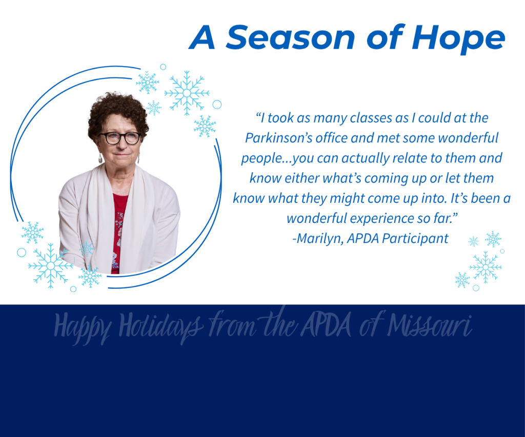 American Parkinson Disease Association Missouri Chapter Weekly Email Sign Up Upcoming Events Newly Diagnosed Resources Your gift creates hope. Donate Today Support Groups Share, learn, and laugh with others who understand.Click to discover a support group near you. Exercise Build confidence and mobility through movement made for you.Click here to join an exercise class! About the American Parkinson's Disease Association Missouri Chapter The APDA Missouri Chapter works tirelessly every day to support and empower those in our community who are impacted by Parkinson’s disease (PD). We promote hope and optimism through innovative services, programs, education, and support, while also funding vital research. We are here to help you and your loved ones every step of the way. Welcome to APDA! Whether you’re living with Parkinson’s, caring for someone who is, or simply looking to learn more — our Welcome Packet is a great place to start. It’s packed with reliable information and ways to connect with your local APDA community.Click HERE to request a welcome packet today! Services we provide: Educational Programs Support Groups Exercise & Wellness Classes Information & Referrals Contact Information Address:16100 Chesterfield Parkway W Suite 125Chesterfield, Missouri 63017 Email: apdamo@apdaparkinson.orgPhone: 636-778-3377 Hours of Operations:Monday: By Appointment OnlyTuesday - Friday: 9:00 am - 4:00 pmSaturday & Sunday - closed APDA Center for Advanced Research at Washington University School of Medicine Washington University School of Medicine The American Parkinson Disease Association - Missouri Chapter funds the APDA Center for Advanced Parkinson Disease Research at Washington University School of Medicine. Joel S. Perlmutter, MD, Director APDA funding supports: Provided pilot data for six currently funded NIH RO1 grants Biomarkers for Parkinson's Disease & cognitive impairment occurrence Exercise, emphasizing gait and balance More than 4,000 Parkinson's Disease patient visits Chapter MenuAbout APDA MissouriMissouri Chapter Staff and Board of DirectorsCareer OpportunitiesContact UsIn the NewsFundraising Events2025 Missouri Optimism Walks RecapGolf ClassicWays To GiveDonateResources & SupportAdd me to the APDA Missouri Chapter Mailing ListGet Your APDA Welcome PacketSupport GroupsExerciseYouTube VideosExercise at HomeBuilding Your AbilitiesMissouri Exercise ClassesSimply StrongerExercise SpecialistsExercise Class DescriptionIllinois Exercise ClassesVoice ExercisesCognitive ExercisesEducationMidwest Parkinson’s Conference 2026Parkinson's Education ProgramsPRESS ONWellness ProgramsCare Partner ConnectionNewly Diagnosed ResourcesParkinson’s Articles and InformationNewsletterResearchUpcoming Chapter Events Help our community Make an impact to help people with Parkinson’s in your local community. Your ongoing support makes our work possible. Please give what you can so that we may see a cure for Parkinson’s in our lifetimes. DONATE TODAY Contact APDA Email: apdamo@apdaparkinson.org Phone: 636-778-3377 Address: 16100 Chesterfield Parkway West Suite 125 Chesterfield, Missouri 63017 Support Our Mission To support the PD community, please click the button below: Donate Today Ask a Doctor Share Your Story Search DonateChapter Menu