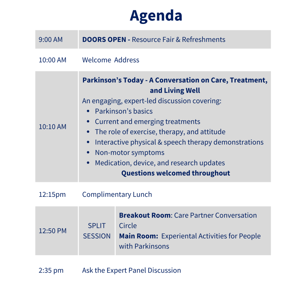 Join us for a conversation-driven experience designed to inform, empower, and connect. Whether you’re living with Parkinson’s, caring for someone who is, or simply want to learn more, you’ll find real talk, practical tools, and a supportive community.